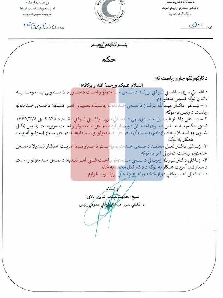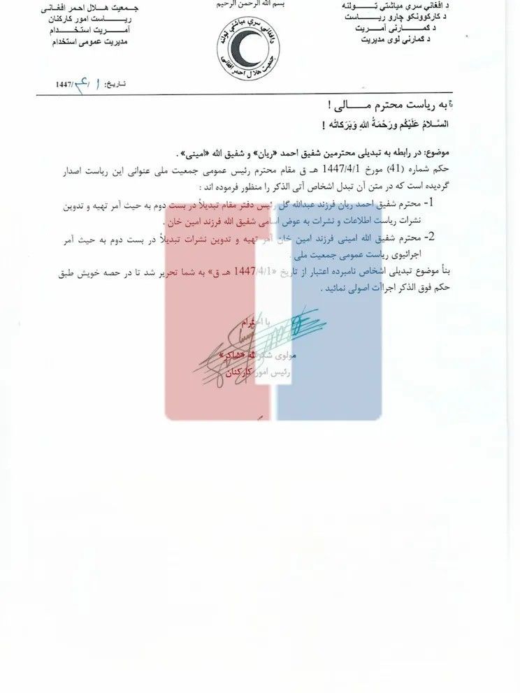 فیصل احمدزی، رئیس امور صحی جمعیت هلال احمر ولایت کابل، برکنار و عبدالله عرفان، باشند لوگر، به جای او گماشته شده است.