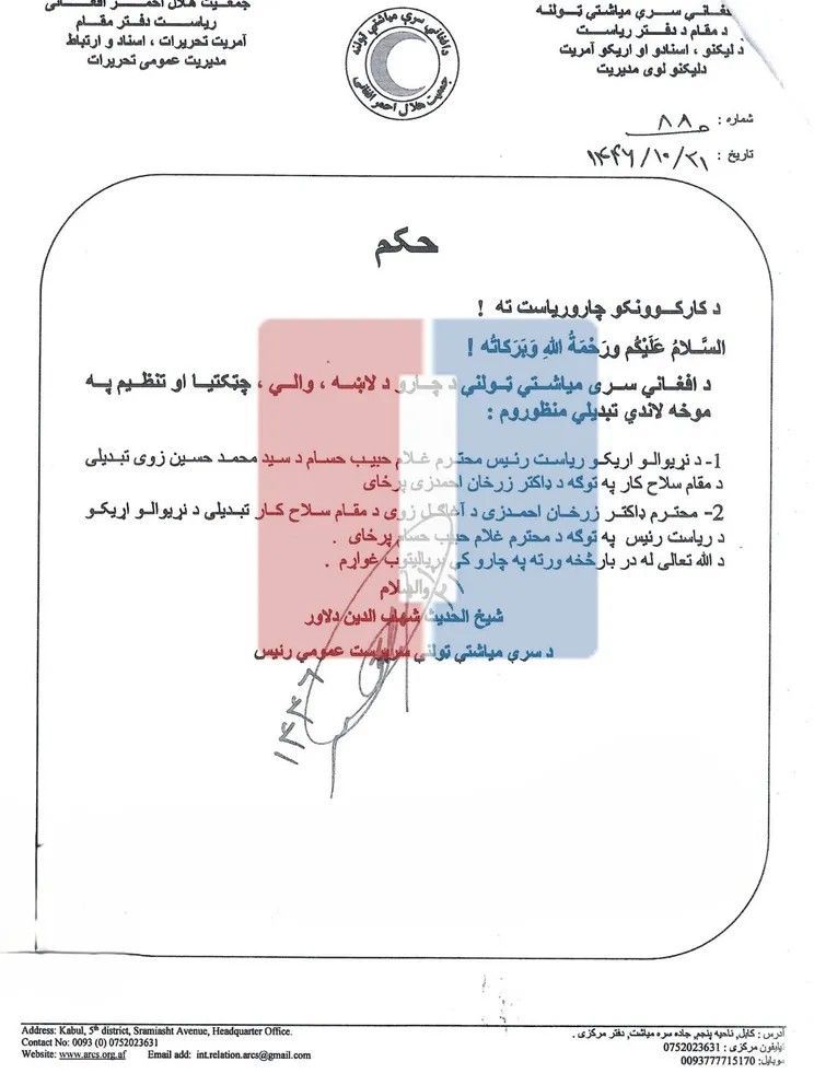 همچنین غلامحبیب حسام، رئیس روابط بینالمللی جمعیت هلال احمر ولایت ننگرهار، برکنار و زرخان احمدزی، باشند لوگر، به جای او تعیین شده است.