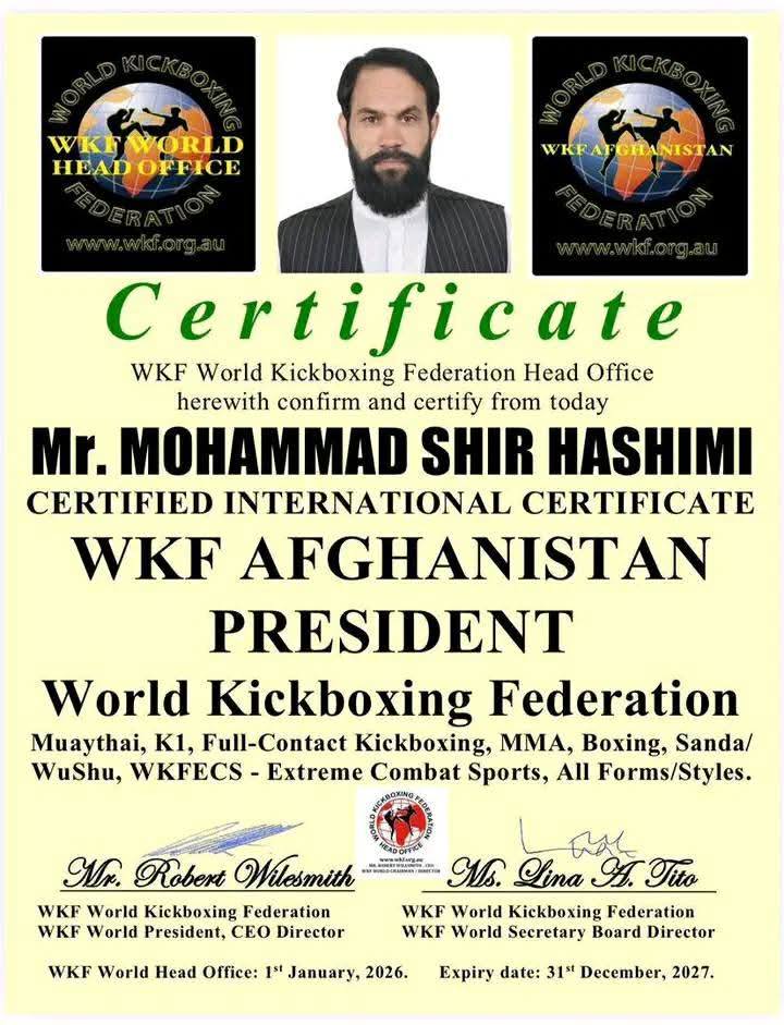 فدراسیون کیک‌بوکسینگ افغانستان، بر بنیاد اعلام و اسناد ارائه‌شده از سوی مسئولان این نهاد، موفق شد عضویت رسمی فدراسیون جهانی کیک‌بوکسینگ را به‌دست آورد. فدراسیون جهانی این عضویت را تأیید کرده و محمدشیر هاشمی به‌عنوان نماینده رسمی فدراسیون کیک‌بوکسینگ افغانستان معرفی شده است.