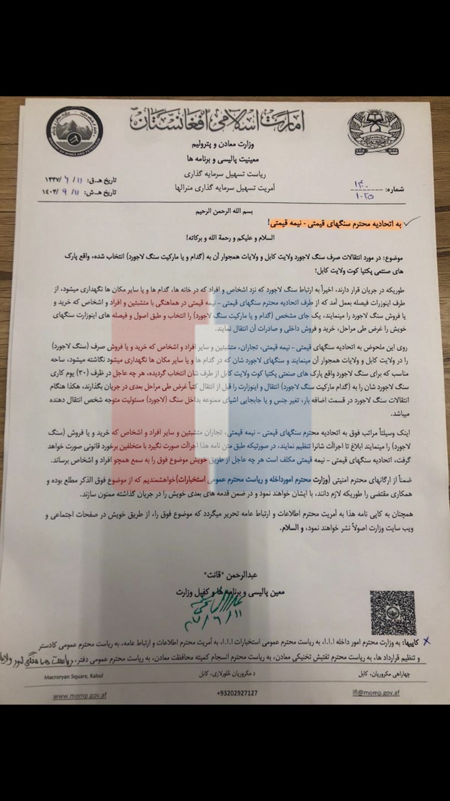 بر اساس اسناد رسمی که یک نسخه آن به افغانستان اینترنشنال رسیده، این دستور در ۱۱ قوس ۱۴۰۴ از سوی عبدالرحمان قانت، معین پالیسی و برنامههای این وزارت صادر شده و به بازرگانان یک ماه مهلت داده شده است تا لاجوردهای خود را به این پارک صنعتی منتقل کنند.