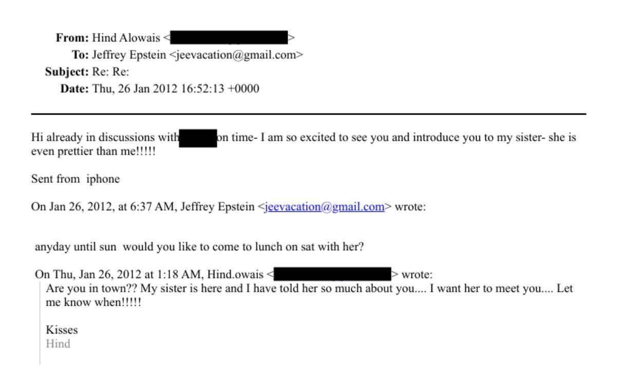 در ایمیل دیگری که در جنوری ۲۰۱۲ میان خانم العویس و اپستین رد و بدل شده، او از خواهر خود برای اپستین تعریف میکند و میخواهد این دو همدیگر را ملاقات کنند.