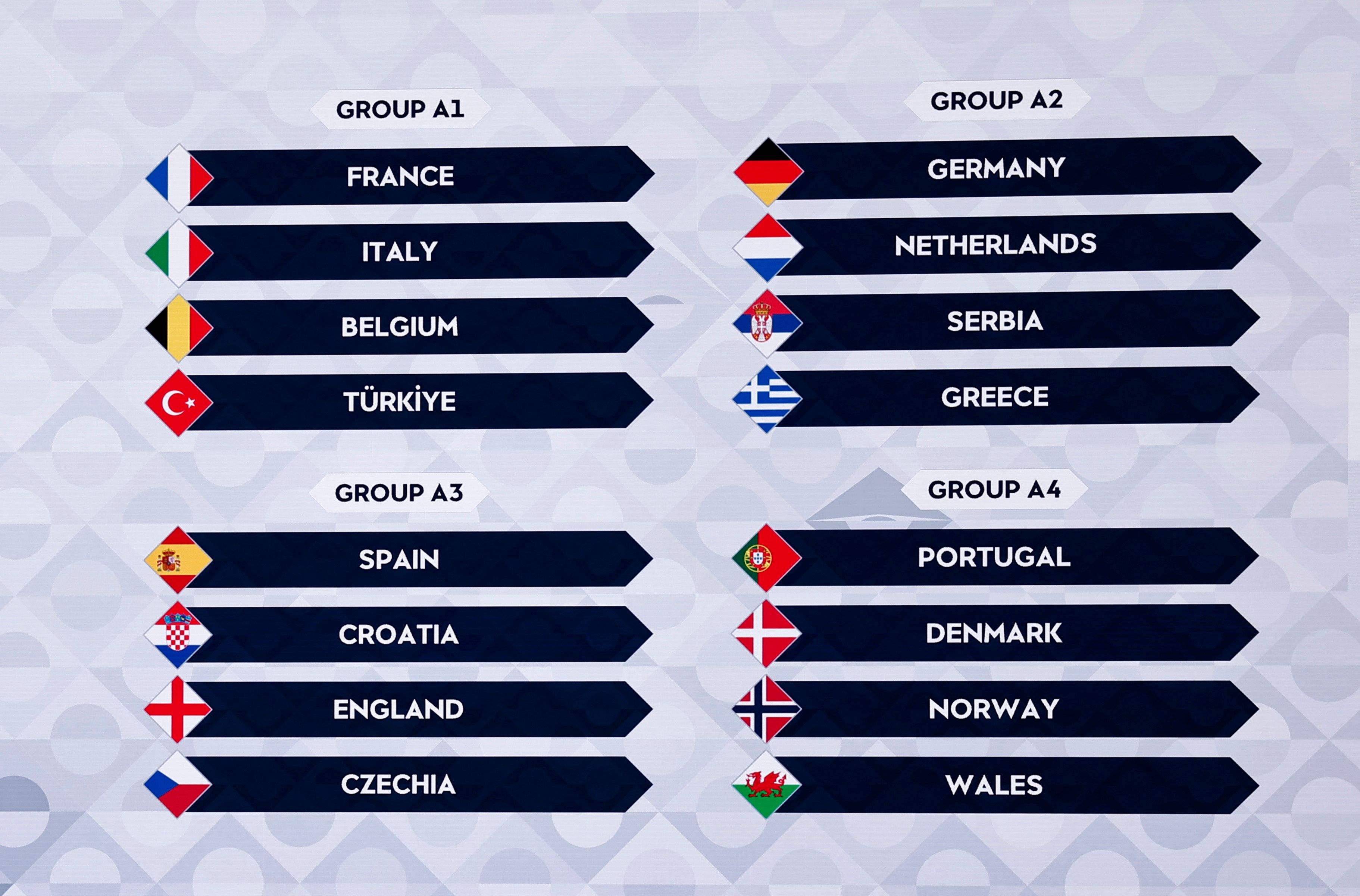 در دیگر گروههای لیگ A، فرانسه و ایتالیا برای دومین دوره پیاپی در یک گروه قرار گرفتند و همراه با بلجیم و ترکیه، گروه A۱ را تشکیل دادند. آلمان نیز در گروه A۲ با هالند همگروه شد و در کنار صربستان و یونان رقابت خواهد کرد. قهرمان دوره گذشته، پرتگال، در گروه A۴ با دنمارک، ناروی و ولز روبهرو میشود.