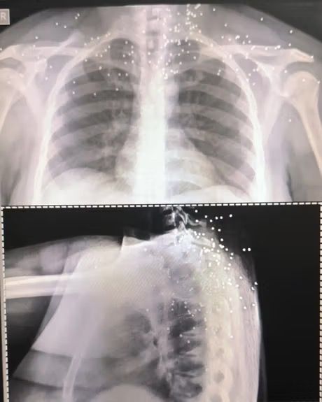 در تصاویر دیگر نیز گلولههایی در نزدیکی ستون فقرات یا مسیرهای مشخص تخریب بافت و استخوان دیده میشود.