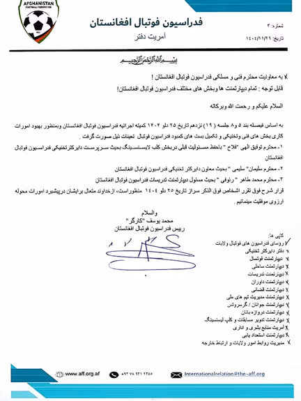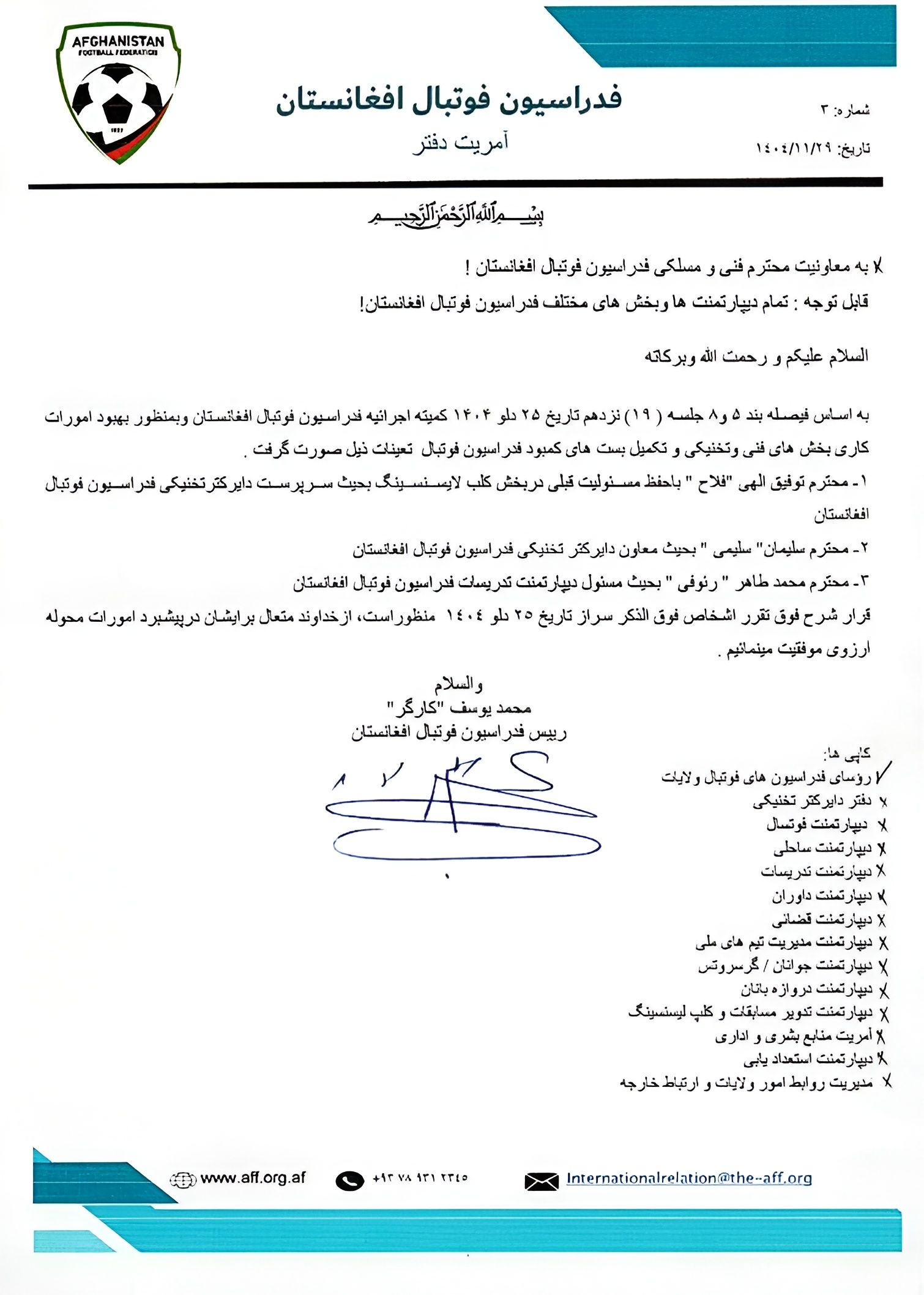 در مکتوبی که از آمریت دفتر با امضای محمد یوسف کارگر به معاون فنی و مسلکی فدراسیون ارسال شده، آمده است که براساس فیصله کمیته اجرائیه فدراسیون و بهمنظور بهبود امور در بخشهای فنی و تکنیکی، تغییراتی در ساختار و پُستهای این اداره ایجاد میشود.