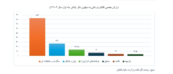 کتاب: ارزش واردات کتاب در ششماهه نخست ۱۴۰۴ حدود ۴ میلیون دالر بوده است. با توجه به محدودیتها و سانسور گسترده بر واردات کتاب، ترکیب این اقلام شفاف نیست. ولی به نظر میرسد بخش عمده آن را کتابهای تشکیل میدهد که در راستای ایدیولوژی طالبان قرار دارند. نکته قابل تأمل دیگر آن که ارزش واردات ساجق بیش از یکونیم برابر واردات کتاب بوده است، مقایسهای که جهتگیری مصرف ارزی را بهروشنی نشان میدهد.