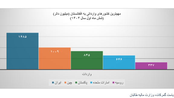 در مقابل، بازار پاکستان برای کالاهای افغانستان دسترسپذیرتر بوده است. سال گذشته پاکستان با ۷۴۳ میلیون دالر در صدر مقاصد صادراتی قرار داشت و در ششماهه نخست ۱۴۰۴ نیز با ۳۰۳.۴ میلیون دالر بزرگترین بازار صادراتی افغانستان بود.