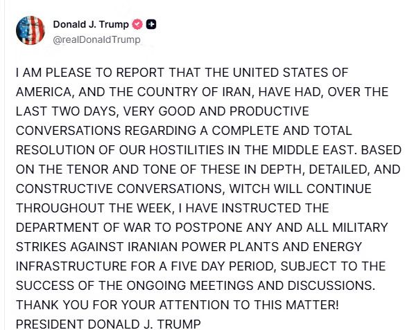 دونالد ترامپ، رئیسجمهور امریکا، از مذاکرات «سازنده» با تهران خبر داد و اعلام کرد هرگونه حمله به نیروگاهها و زیرساختهای انرژی ایران به مدت پنج روز به تعویق خواهد افتاد. در سوی دیگر، وزارت خارجه جمهوری اسلامی و رسانههای وابسته به سپاه گفتوگو با واشنگتن را تکذیب کردند.