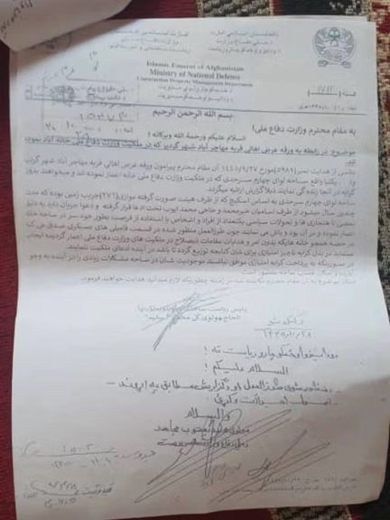 وعرض الجنود وثيقة على قناة "أفغانستان إنترناشيونال" تحمل توقيع وزير الدفاع ملا يعقوب، تتضمن توجيهاً لتحديد إيجارات لهذه المنازل بهدف منع الجنود من المطالبة بملكية الأرض.