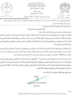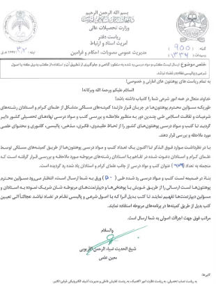 وبحسب وثيقة حصلت على نسخة منها قناة أفغانستان إنترناشیونال، كتب ضياء الرحمن الأريوبي، معاون وزير التعليم العالي للشؤون العلمية بتاريخ الرابع من سنبله الحالي، أن علماء الدين وأساتذة تخصصات الشريعة والثقافة الإسلامية قاموا بمراجعة هذه الكتب من حيث «العقيدة، الفكر، الدين، السياسة، الثقافة والمحتوى العلمي».