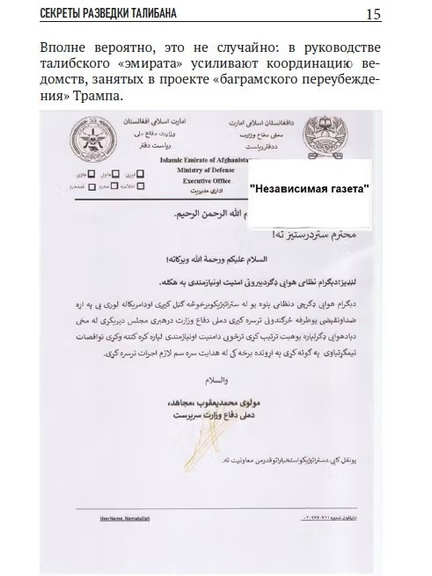 ونشر الباحث أيضاً وثيقة موقعة من وزير الدفاع في طالبان، تشير إلى أن الملا يعقوب أصدر أمراً بتشكيل وفد لتقييم أوجه القصور والنواقص في قاعدة باغرام.