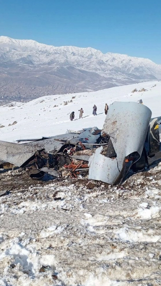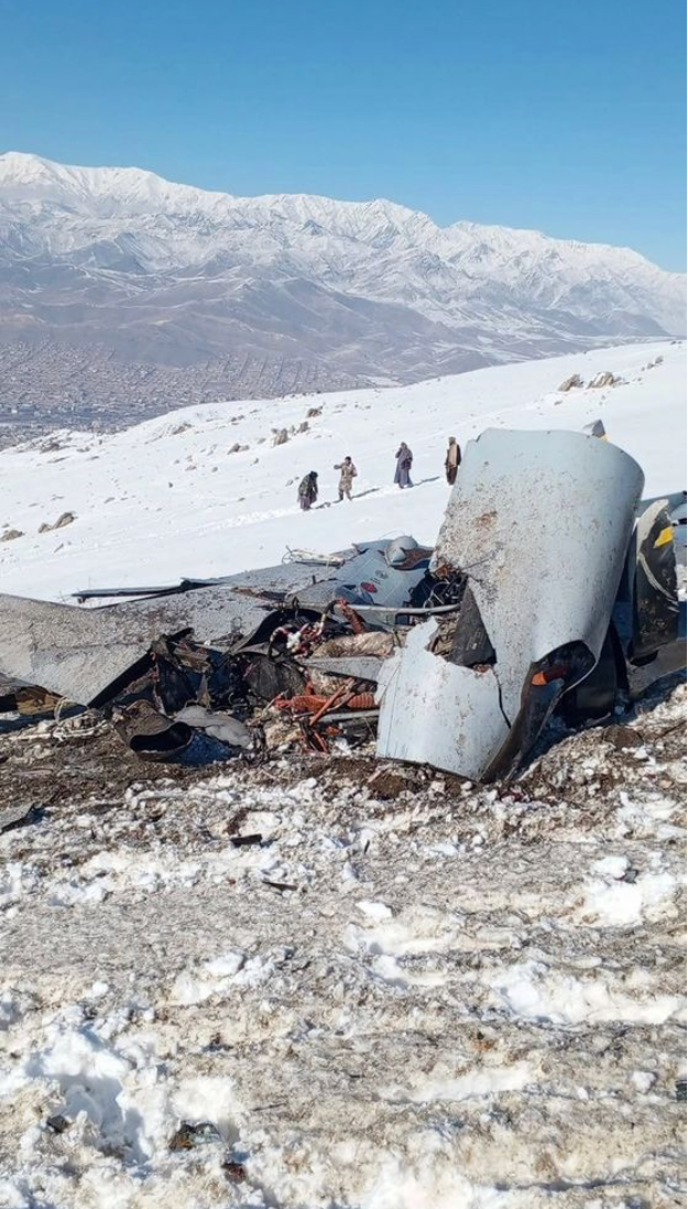 Taliban members circulated images on social media showing the wreckage of an overturned drone lying on a snow-covered hillside, with Taliban fighters seen standing around the remains.