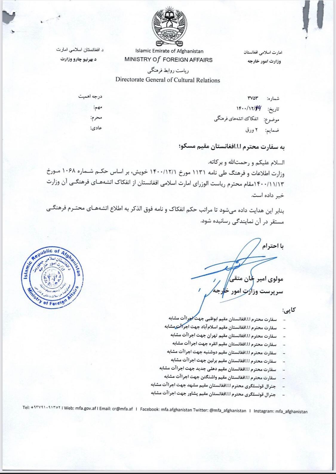 بر اساس مکتوب پیشنهادی وزارت اطلاعات و فرهنگ و منظوری ریاستالوزرای طالبان، اتشههای فرهنگی سفارتهای افغانستان در روسیه، امارات متحده عربی، پاکستان، ایران، ترکیه، تاجیکستان، جرمنی، هندوستان و امریکا برکنار شدهاند.