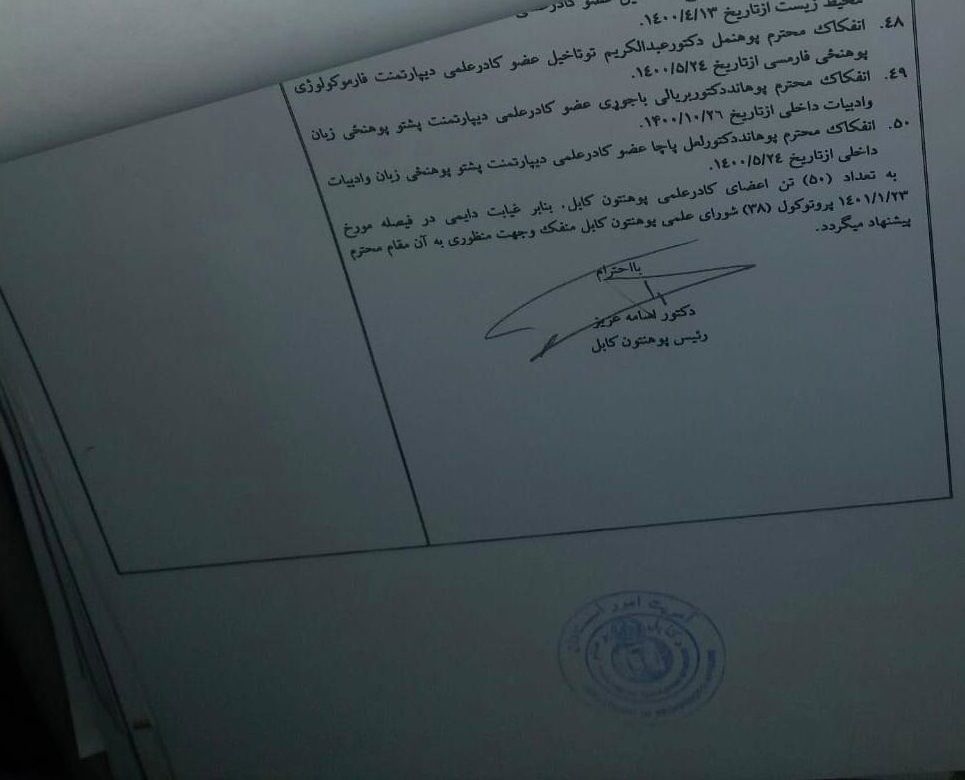 بر اساس مکتوبی که به افغانستان اینترنشنال رسیده است، طالبان ۵۰ عضو کادر علمی دانشگاه کابل را منفک کرده است. در این مکتوب که با امضای رئیس گماشته‌شده طالبان برای دانشگاه کابل به وزیر تحصیلات عالی این گروه فرستاده شده، دلیل برکناری این کادر‌های علمی “غیابت دایمی” عنوان شده است.