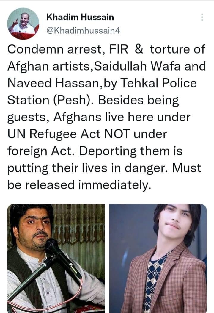 شماری از هنرمندان در پیشاور پاکستان روز دوشنبه ۹ جوزا، در اعتراض به بازداشت و اخراج اجباری برخی از نوازندگان افغانستان از سوی پولیس، راهپیمایی کردند. پولیس پیشاور اخیراً شماری از نوازندگان افغان را که برای نجات از دست طالبان به پاکستان رفته بودند، بازداشت کرده است.