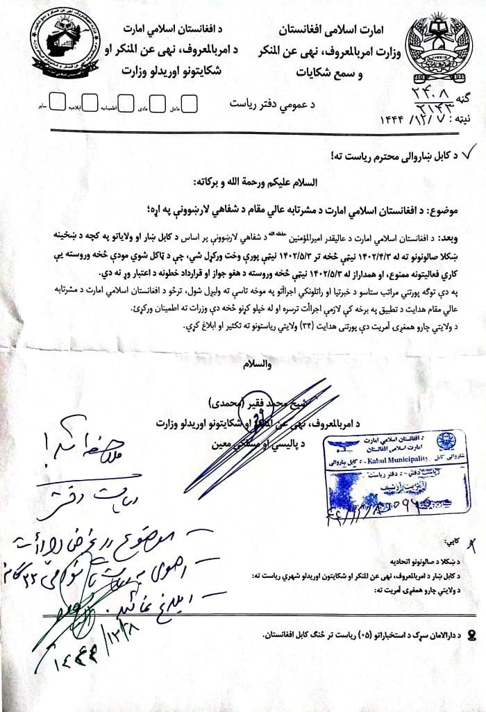وزارت امر به معروف و نهی از منکر طالبان در این نامه عنوانی شهرداریهای کابل و ولایتها، از این نهادها خواسته که به آرایشگاههای زنان از سوم سرطان تا سوم اسد فرصت دهند که به فعالیتهای خود پایان دهند.
