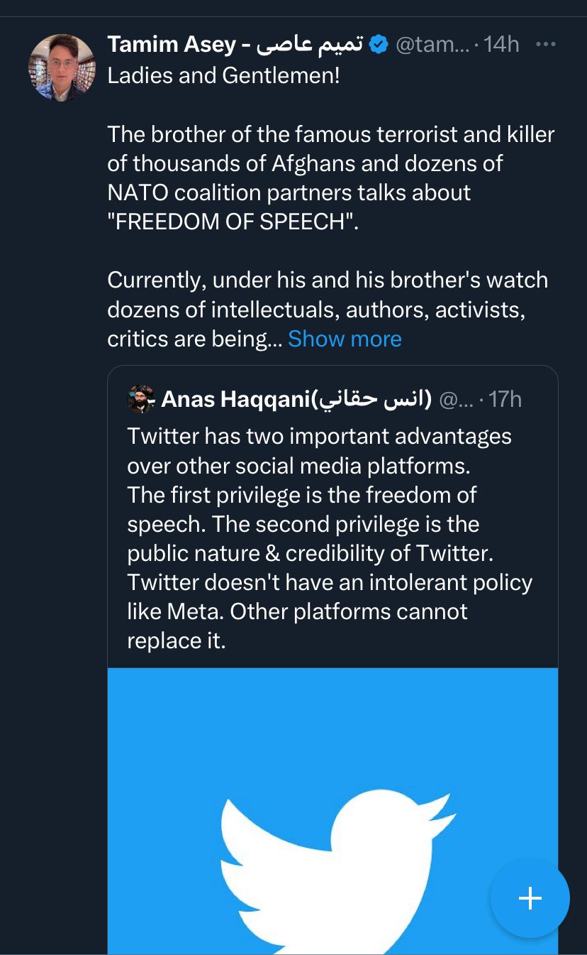با وجود نقض شدید آزادی بیان در افغانستان تحت کنترل طالبان، این چهره شناخته شده شبکه حقانی روز دوشنبه در توییتی نوشت که تردز شرکت متا جای توییتر را نمی گیرد چون امتیاز توییتر "آزادی بیان" است.