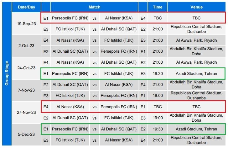 کنفدراسیون فوتبال آسیا به صورت رسمی جدول برگزاری رقابتهای مرحله گروهی لیگ قهرمانان آسیا را اعلام کرده است. در این جدول، ورزشگاه میزبان تمام تیمها مشخص شده است، به جز مسابقات تیمهای ایرانی با نمایندگان فوتبال عربستان.
