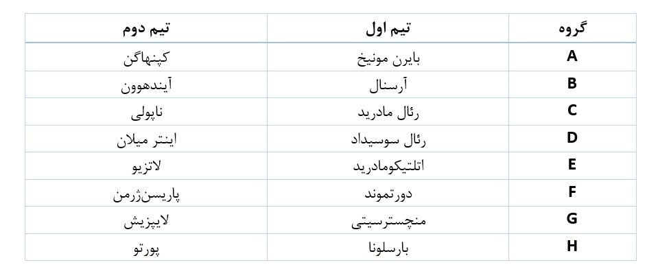 مرحله گروهی لیگ قهرمانان فوتبال اروپا به پایان رسید و ١٦ تیم به یکهشتم نهایی صعود کردند. در نهایت ٤ تیم از اسپانیا، ٣ تیم از آلمان، ٣ تیم از ایتالیا، ٢ تیم از انگلستان و یک تیم از دنمارک، پرتگال، هالند، و فرانسه به مرحله حذفی راه یافتند. به نظر شما کدام تیم قهرمان خواهد شد؟