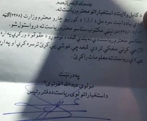 براساس اطلاعات دریافتی، اداره استخبارات طالبان به نامههای وزارت داخله این گروه اعتنا نکرد و باعث شد که عبدالحق وثیق، رئیس عمومی استخبارات طالبان نامهای به اداره استخبارات کابل بفرستد.