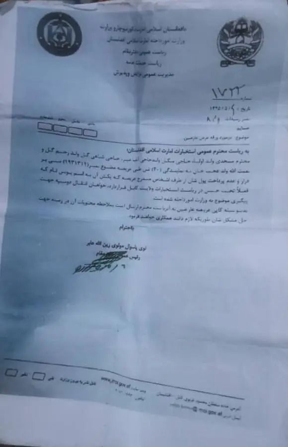 پیشتر، نسخه مکتوبی دیگر به افغانستان اینترنشنال رسید که در آن از مردم در ولسوالی دند پتان ولایت پکتیا خواسته شده بود تا زکات داراییها و اموال خود را بپردازند. در این نامه هم به مردم محلی هشدار داده شده بود که در صورت سرپیچی از دستور، مجازات خواهند شد.