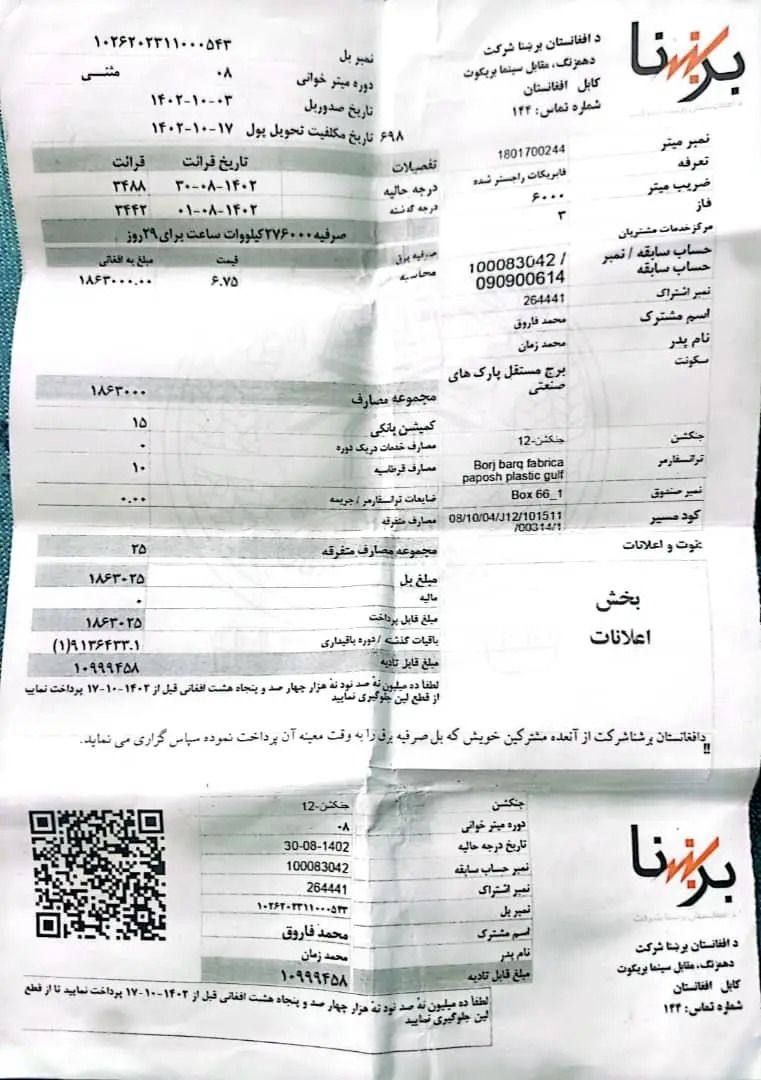 حالا اسناد و مدارک نشان میدهد که این کارخانه که به نام این شهروند پاکستانی ثبت شده، ۱۰ میلیون افغانی از شرکت برق افغانستان و ۹۰۰ هزار دالر از شهروندان این کشور که آهنپاره میفروشند، بدهکار است.