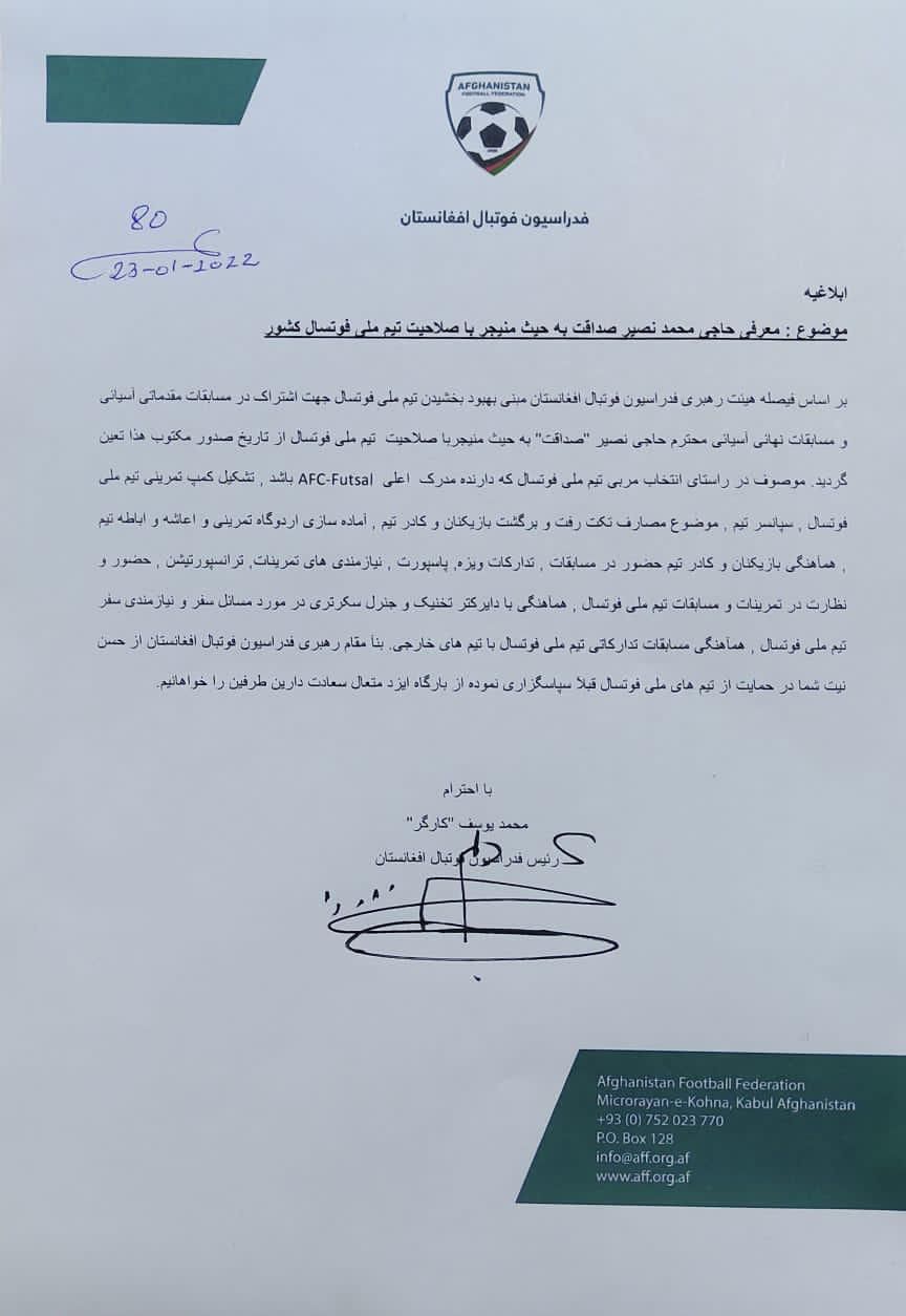 از سوی دیگر در نامهای که به افغانستان اینترنشنال رسیده آمده است که تیم ملی فوتسال افغانستان به محمد نصیر صداقت، یکی از بازرگانان افغانستان سپرده شده است. در مکتوب آمده است که نصیر صداقت تمام صلاحیت تیمهای ملی فوتسال افغانستان را به عهده دارد.