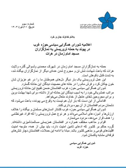 شورای همگرایی سیاسی غرب افغانستان در واکشن به حمله داعش به مسجد شیعیان در هرات، درباره دچار شدن افغانستان به سرنوشت پاکستان هشدار داد. این تشکل حمله به مسجد امام زمان در شهرک محمدی هرات را محکوم کرد و گفت: اقوام و مذاهب مختلف همواره در افغانستان همزیستی مسالمتآمیزی داشتهاند.
