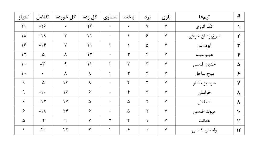 جدول ردهبندی مسابقات در پایان هفته هفتم: