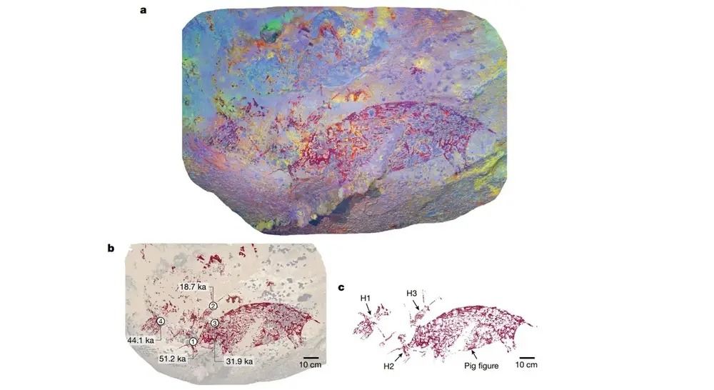پژوهشگران از نزدیک یک نگاره بر روی صخرهای را بررسی کردند که سه پیکر انسانمانند را در حال تعامل با یک خوک به تصویر میکشد.