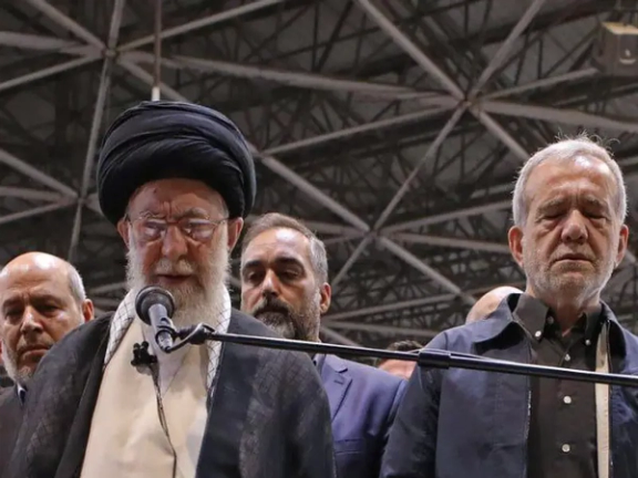 رسانههای ایران تصاویری از مراسم تشییع جسد اسماعیل هنیه و نماز خامنهای بر پیکر او را منتشر کردهاند که در یکی از آنها مسعود پزشکیان، رییسجمهور، در کنار خامنهای حین خواندن نماز دیده میشود که در حال گریه کردن است.