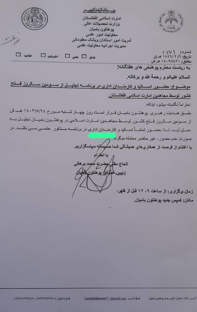 دانشگاه بامیان خواستار حضور اجباری استادان و کارمندان اداری در جشن پیروزی طالبان شد