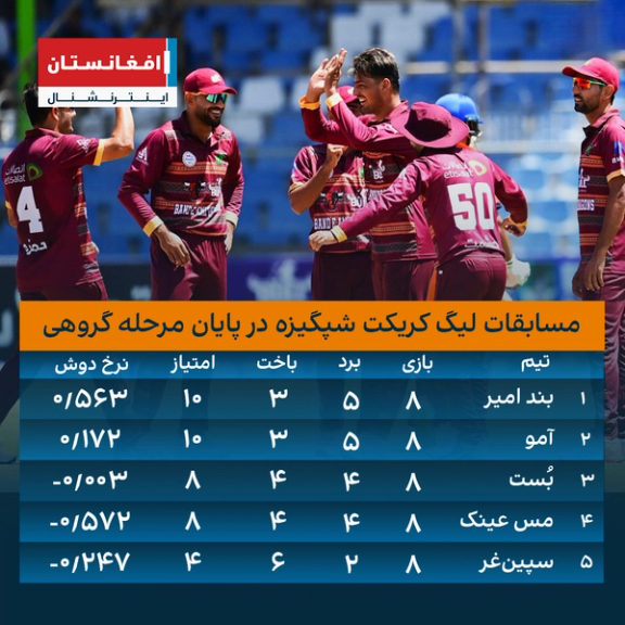 مرحله مقدماتی فصل نهم مسابقات کریکت ٢٠ آوره شپگیزه روز گذشته به پایان رسید و تیمهای بند امیر و آمو به عنوان تیمهای اول و دوم جدول ردهبندی به دیدار نهایی راه یافتند. هر دو تیم پس از ٨ بازی، ١٠ امتیاز کسب کردند. دیدار نهایی این مسابقات فردا ساعت ١١:٠٠ در کابل برگزار خواهد شد.
