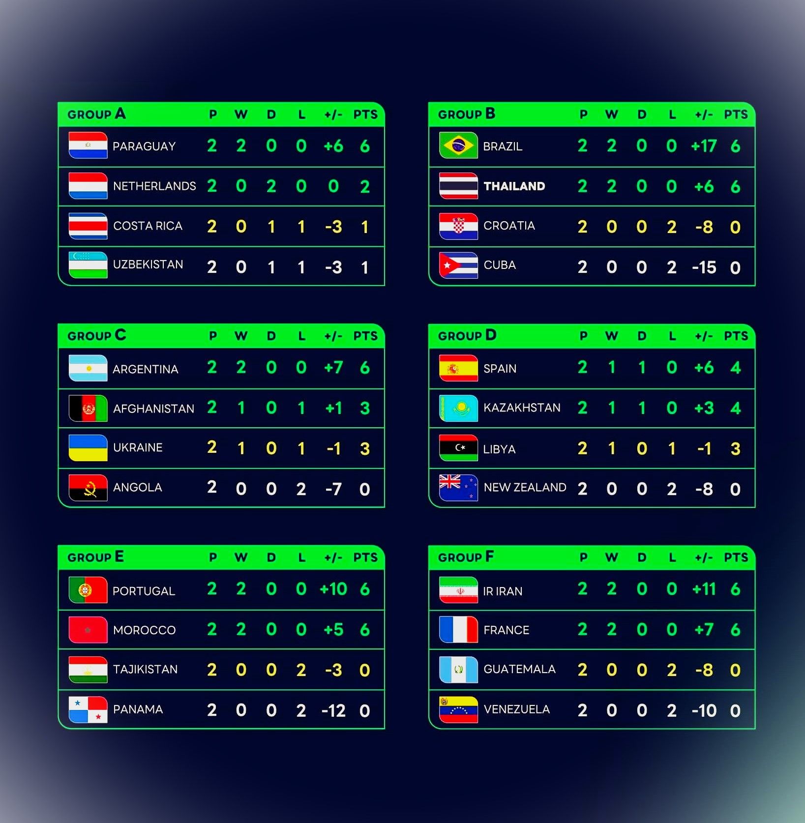 از گروه دوم نیز صعود تیمهای برازیل و تایلند با شش امتیاز به یکهشتم نهایی جام جهانی قطعی است. تیمهای کیوبا و کرواسیا شانس اندک برای صعود دارند.