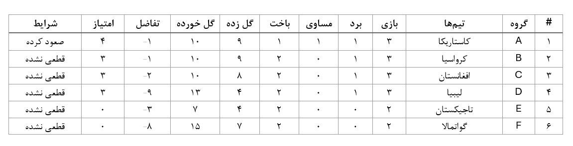 ایران با ٦ امتیاز، فرانسه با ٦ امتیاز و گواتمالا بدون امتیاز (قطعی نیست/ ٨-) (یک بازی مانده)