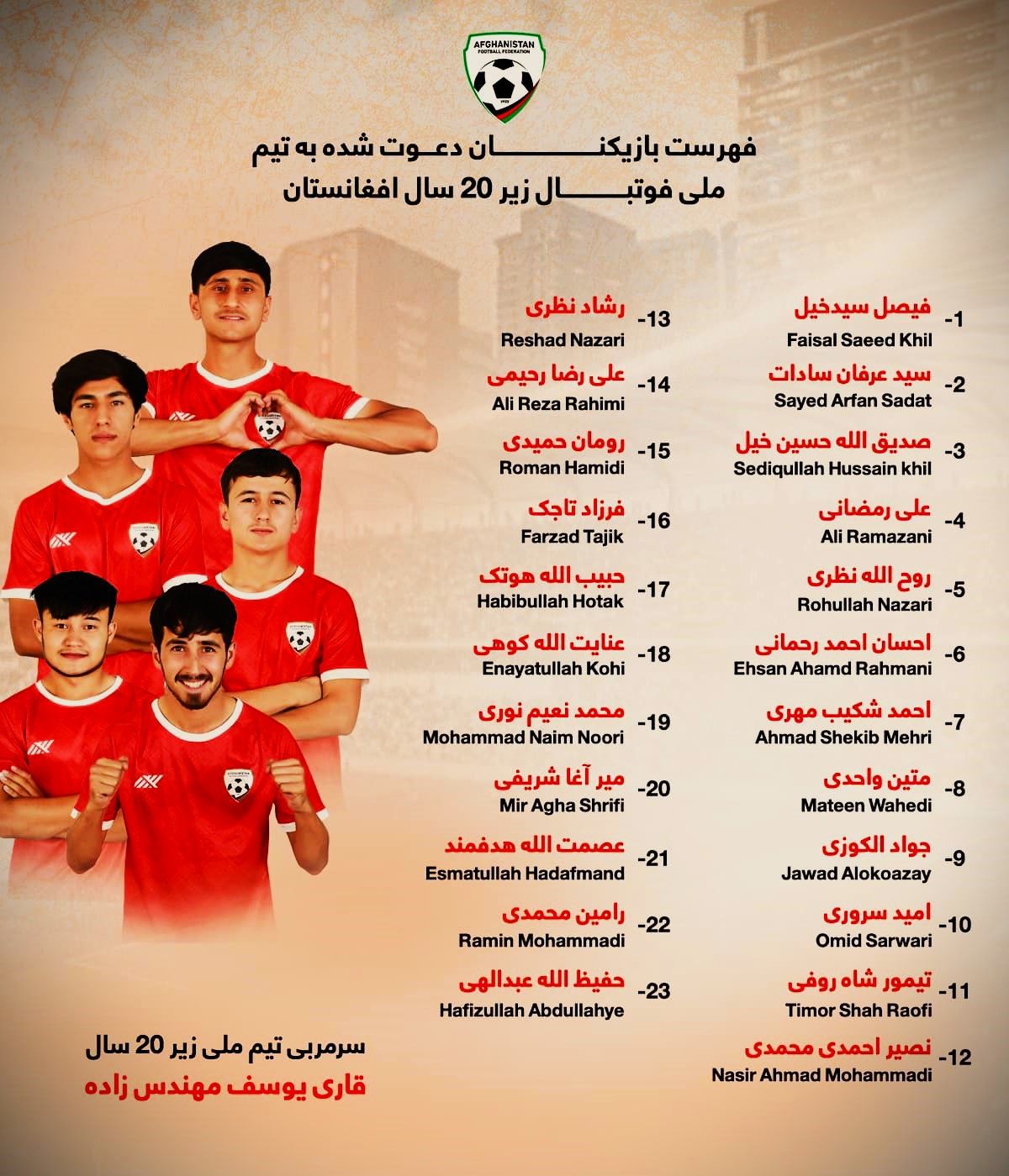 چندی پیش یوسف مهندسزاده، سرمربی تیم زیر بیست سال افغانستان فهرست نهایی ٢٣ بازیکن این تیم را اعلام کرد.