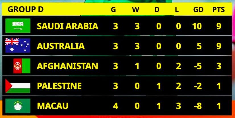 در حال حاضر تیمهای عربستان و آسترالیا با ٩ امتیاز از سه بازی در گروه چهارم اول و دوم هستند.