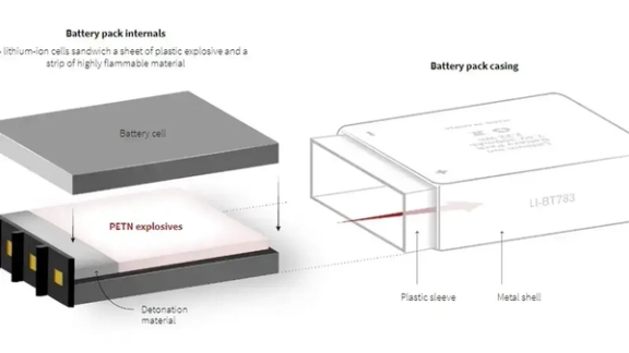 این منبع گفت که فضای باقیمانده بین سلولهای باتری در عکسها دیده نمیشود، اما با نواری از مواد بسیار قابل اشتعالی که به عنوان چاشنی عمل میکردند، جدا شده بود.