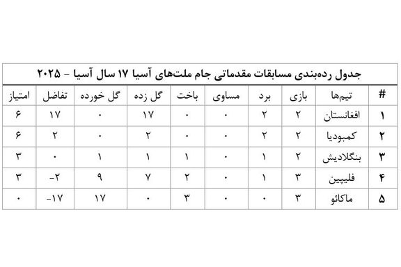 فردا جمعه ٤ عقرب ١٤٠٣، تیم فوتبال ١٧ سال افغانستان در گروه دوم مقدماتی جام آسیایی ٢٠٢٥، به مصاف تیم هفده سال کمبودیا، میزبان این مسابقات میرود. در جدول ردهبندی هر دو تیم با کسب دو پیروزی از دو بازی، شش امتیازی هستند. افغانستان به دلیل تفاضل گل بالاتر صدرنشین و کمبودیا دوم است.