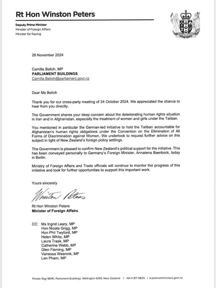 در این نامه آقای پیترز به خانم بیلیچ نوشته که حکومت نیوزلند از طرحی به رهبری آلمان برای وادار کردن طالبان به رعایت حقوق بشر و کنوانسیون رفع هرگونه تبعیض علیه زنان حمایت میکند.