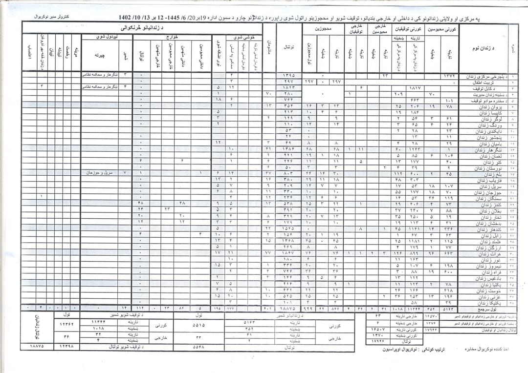 طبق این اطلاعات، مجموع کل زندانیها و بازداشتیها در زندانها و توقیفگاههای مرکز و ولایات به حدود ۱۸ هزار نفر میرسد که شامل۱۶ هزار و ۵۰۷ مرد و بیش از ۱۳ صد زن از شهروندان افغانستان میشود. از میان این زندانیان، ۶۳ مرد خارجی هستند.