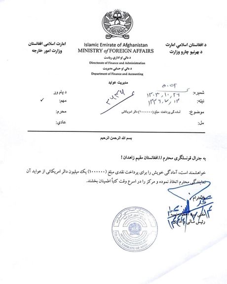 یکی از این نامهها به تاریخ ۲۶ جدی ۱۴۰۳ نشان میدهد که پنج روز پیش از مراسم تحلیف دونالد ترامپ، رئیسجمهور امریکا، وزارت خارجه طالبان در مکاتبهای با قنسولگری افغانستان در زاهدان، درخواست یک میلیون دالر کرده است.