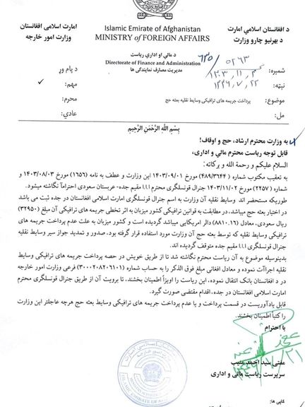 در این مکتوب همچنین تصریح شده که عربستان سعودی بهعلت «عدم پرداخت جریمههای ترافیکی وسایط نقلیه که از سوی بعثه حج آن وزارت مورد استفاده قرار گرفته بود» صدور و تمدید جواز سیر وسایط نقلیه جنرال قنسولگری طالبان مقیم جده را متوقف کرده است.