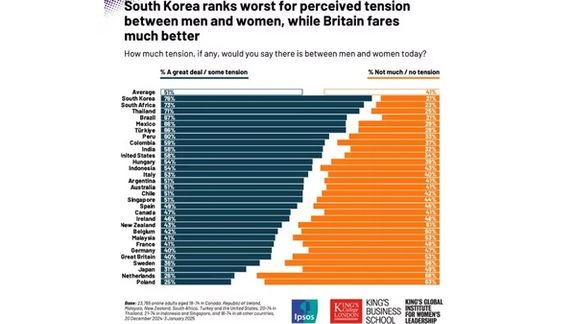 از نظر مقایسه بین کشورها، کوریای جنوبی با ۷۶ درصد بالاترین میزان تنش بین زنان و مردان را در میان ۳۰ کشور مورد مطالعه گزارش کرده است.