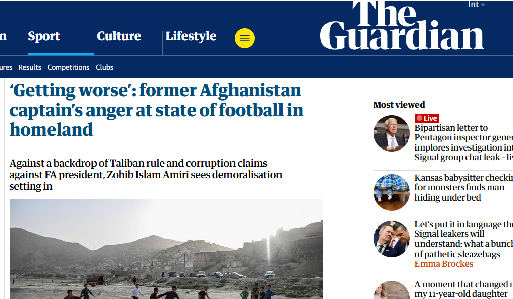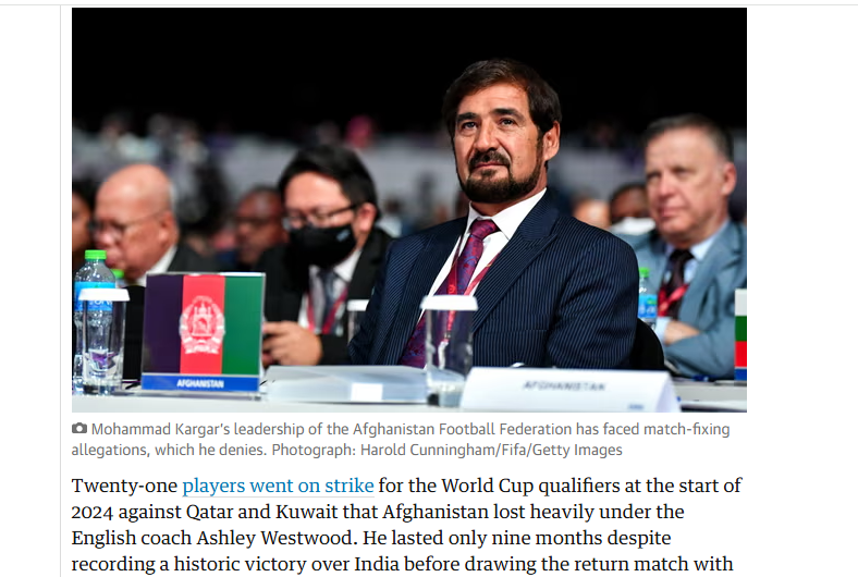 روزنامه «گاردین» بریتانیا مطلبی را منتشر کرده که در آن اسلامالدین امیری، کاپیتان پیشین تیم ملی فوتبال افغانستان شرایط فوتبال این کشور را وخیم دانسته است. او با متهم کردن محمد یوسف کارگر به فساد مالی و تبانی، میگوید که فوتبال ما گروگان فساد و سیاست شده است.