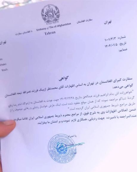 در یک نامه رسمی سفارت افغانستان در تهران که یک نسخه آن به افغانستان اینترنشنال رسیده، دیده میشود که این سفارتخانه از «مراجع محترم ذیربط جمهوری اسلامی ایران» خواسته است برای ردیابی این مهاجر همکاری کنند.