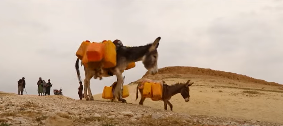 گزارش تلویزیونی، کودکانی را نشان میدهد که بوشکههای آب را بر مرکبها بار میزنند و دستکم یکونیم ساعت از یک مسیر پر پیچ و خم صخرهها میگذرند تا آب آشامیدنی پیدا کنند.