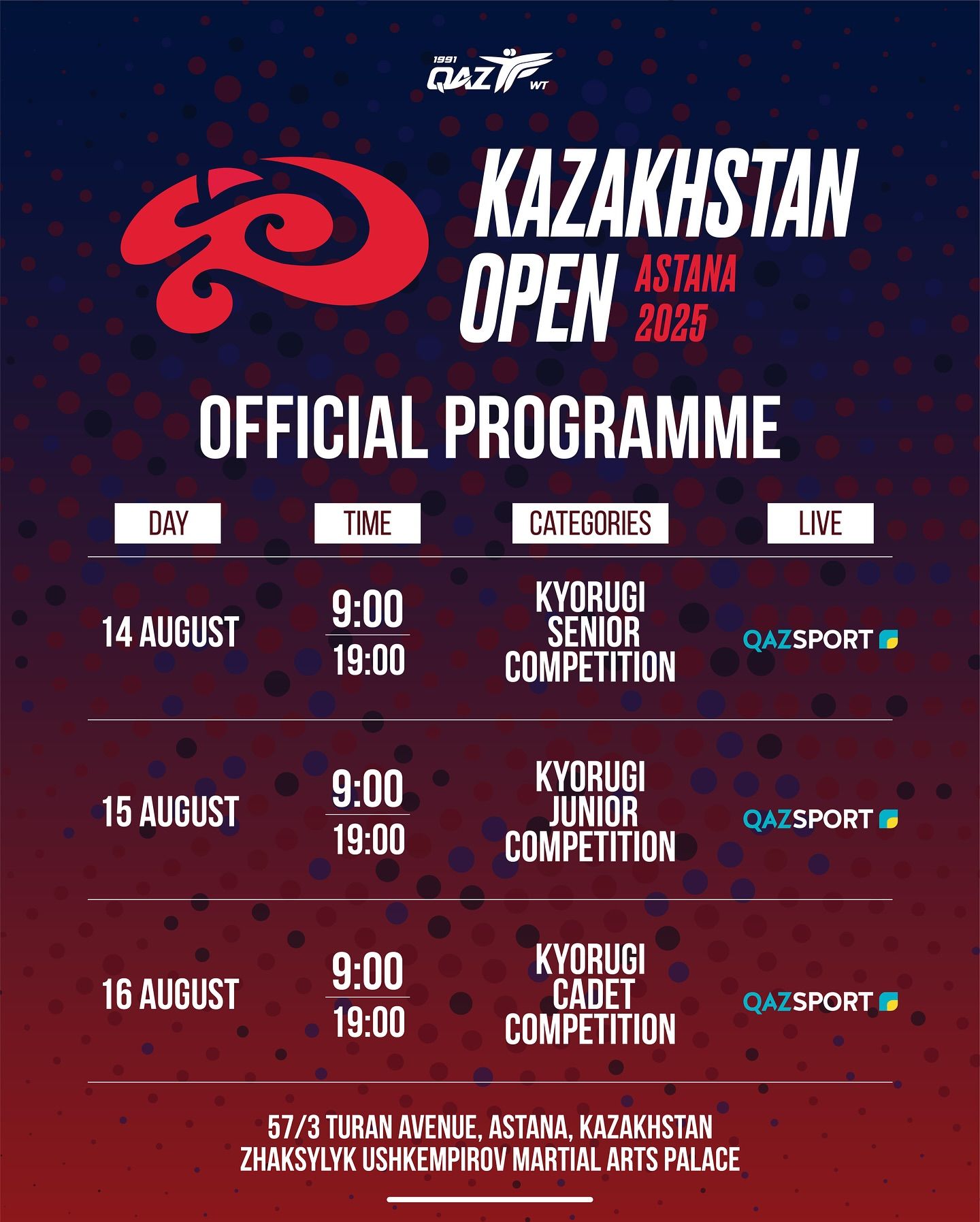 بر اساس اعلام فدراسیون تکواندو قزاقستان، ورزشکارانی از کشورهای افغانستان، ارمنستان، کانادا، فرانسه، هند، ایران، قزاقستان، کویت، قرغیزستان، عمان، لوکزامبورگ، مراکش، نیپال، پاکستان، فلسطین، چین، عربستان سعودی، ترکیه، تونس، امارات متحده عربی و ایالات متحده امریکا در این رقابتها حضور خواهند داشت.