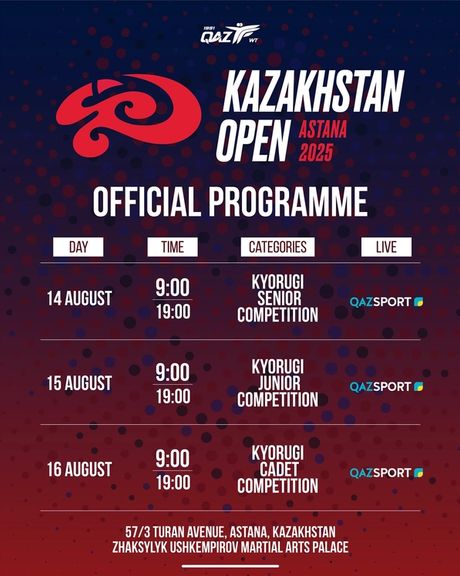 تیم ملی تکواندو افغانستان، که چندی پیش به دلیل هزینههای سنگین و شرایط جنگی در ایران از حضور در مسابقات جهانی بازمانده بود، عازم مسابقات آزاد تکواندو قزاقستان شد. این رویداد بینالمللی از ۲۳ تا ۲۵ اسد ۱۴۰۴، با حضور بیش از ۷۵۰ تکواندوکار از سراسر جهان در شهر آستانه برگزار میشود.