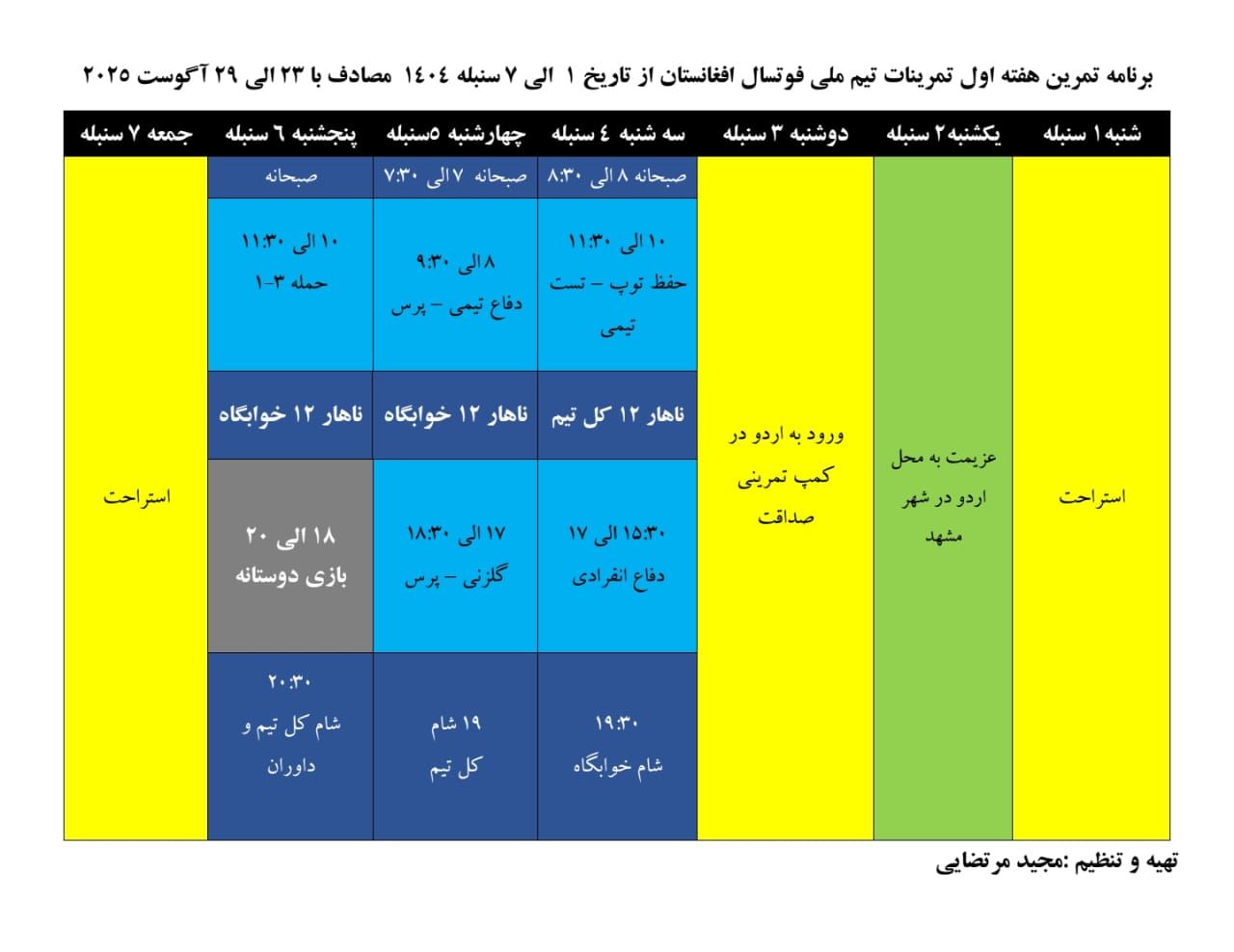 مجید مرتضایی، سرمربی تیم ملی فوتسال افغانستان، اعلام کرد که ملیپوشان کشور پس از حضور در رقابتهای مقدماتی جام آسیایی، در مسابقات فوتسال همبستگی کشورهای اسلامی در عربستان شرکت خواهند کرد. بعد از آن تیم ملی افغانستان برای برگزاری دیدارهای دوستانه راهی روسیه میشود.