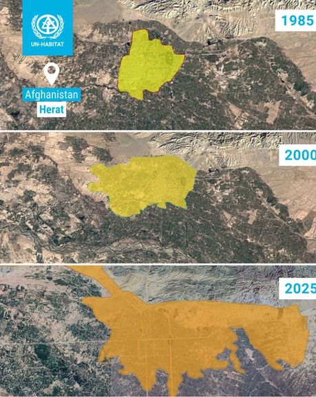 برنامه اسکان بشر سازمانملل روز دوشنبه در صفحه اکس خود تصویر ماهوارهای از گسترش جغرافیایی ولایت هرات را در بازههای زمانی ۱۹۸۵، ۲۰۰۰ و ۲۰۲۵ منتشر کرده است که در آن وسعت جغرافیایی هرات در سال جاری میلادی چندینبار بزرگتر از سال ۱۹۸۵ شده است.